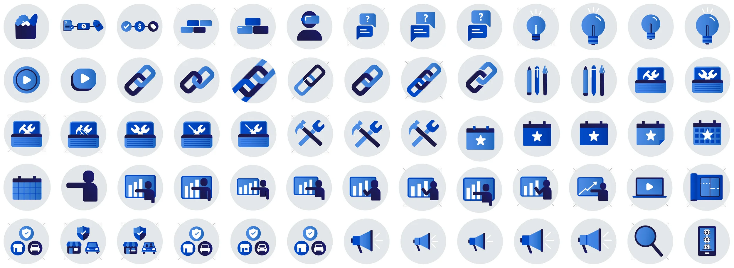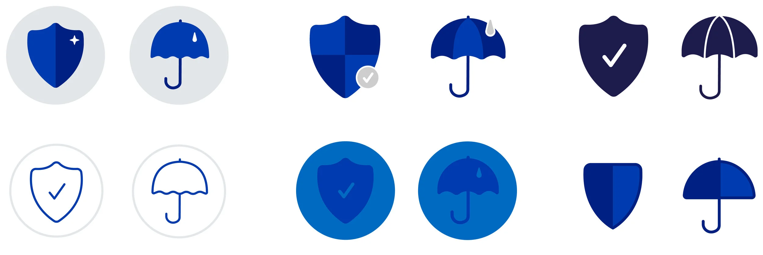 This project was split into three rounds. Each round consisted of brainstorming sessions, sketch iterations, internal and external reviews, and multiple rounds of revisions before the final delivery. In order to gather our bearings, we started by exploring different styles and applied them to two icons (umbrella and shield) that were already approved.